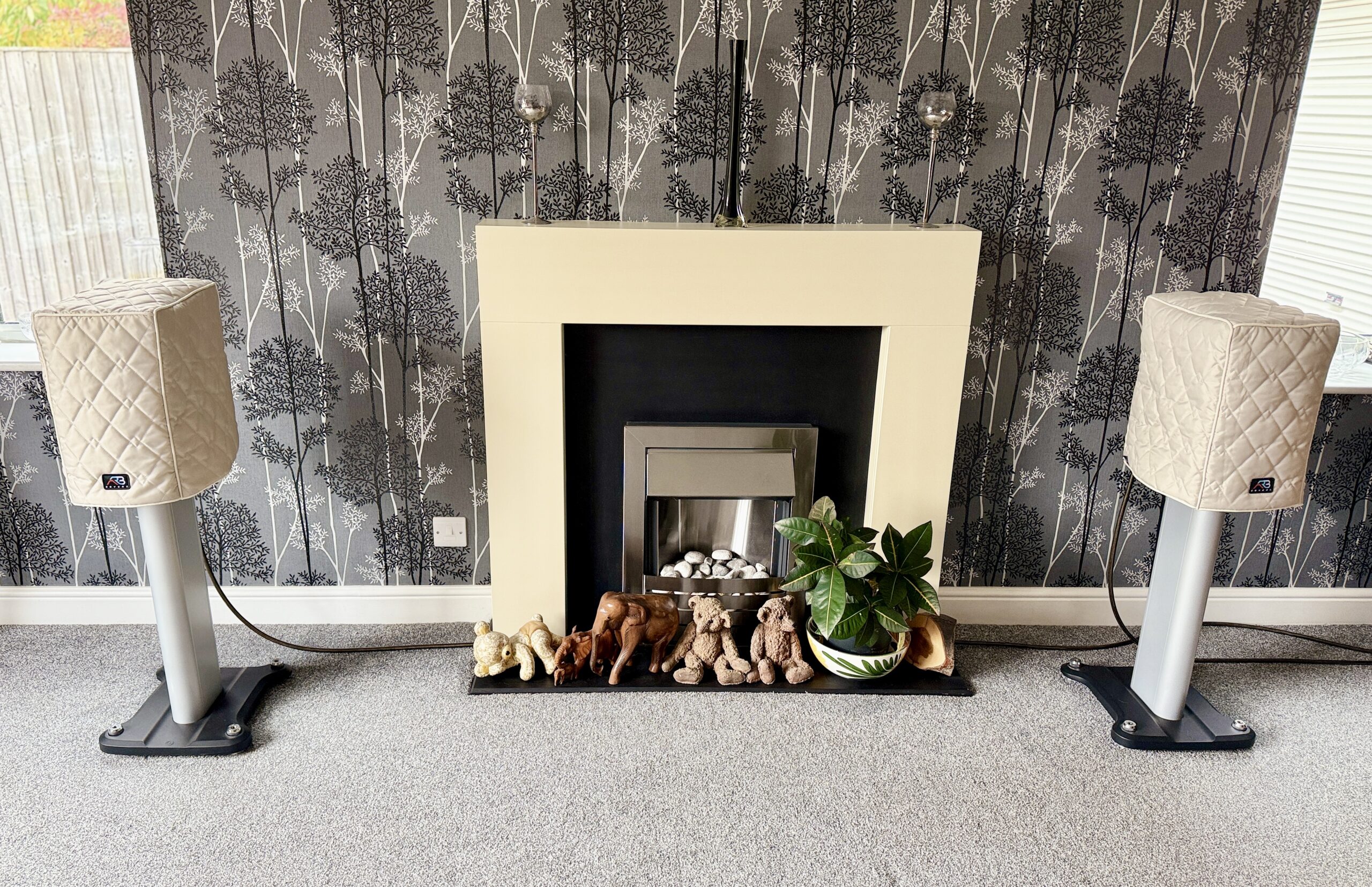 A pair of custom-made ARB Covers for the Kii Audio Three BXT System  (HiFi living room environment)